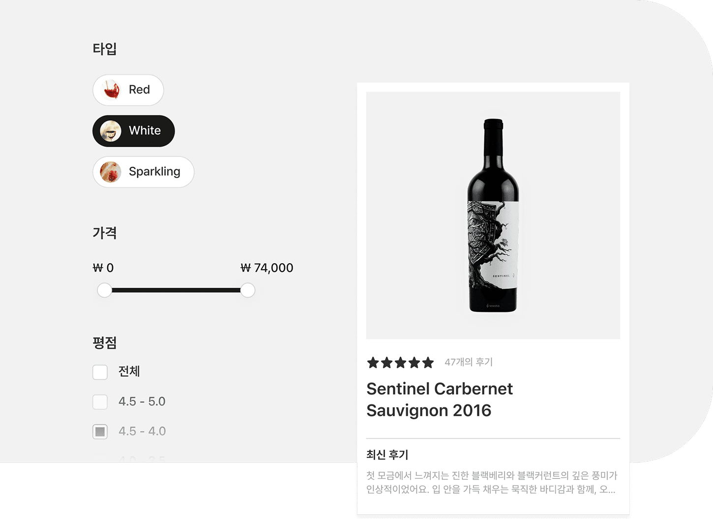 와인 타입, 가격, 평점으로나에게 맞는 와인을 쉽게 검색해요.